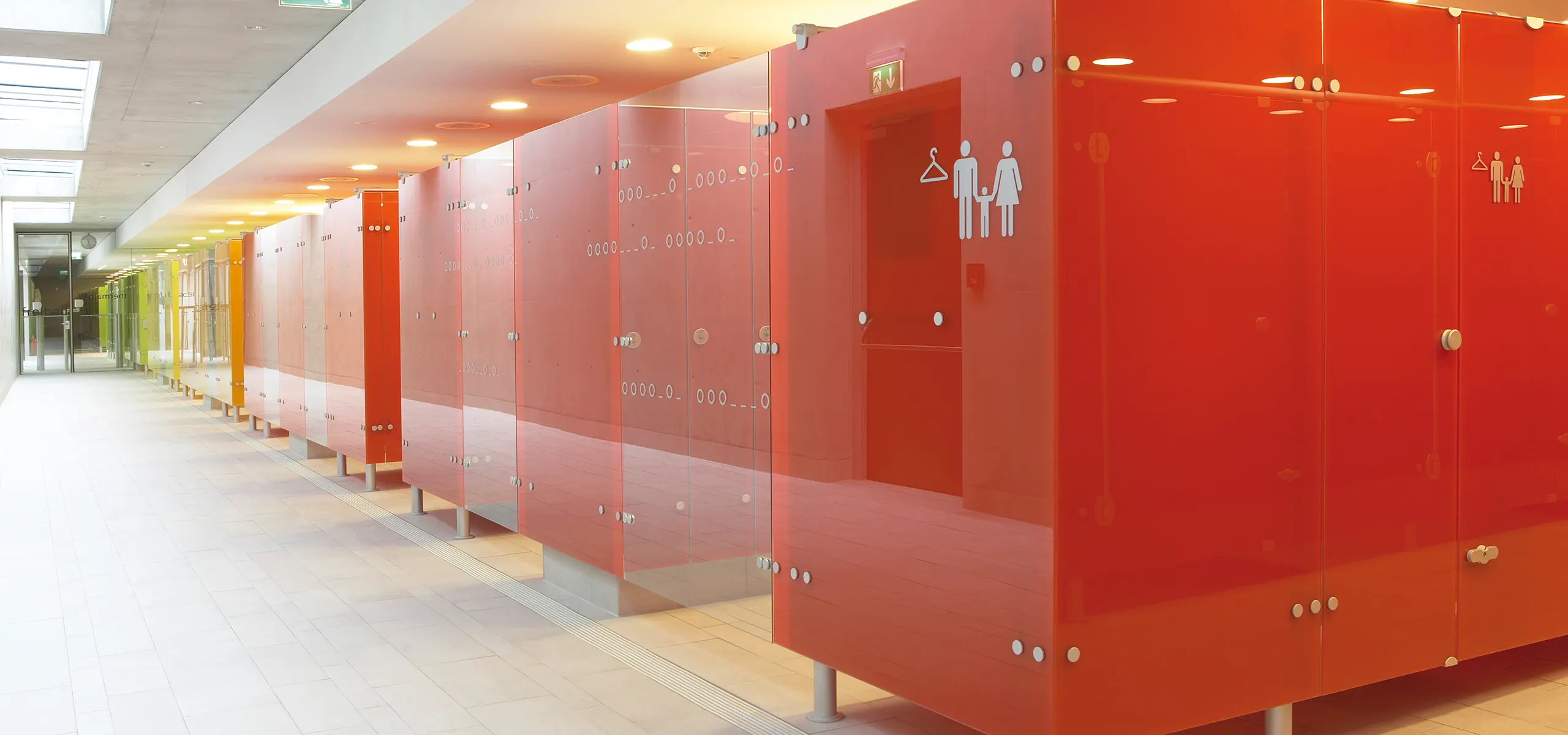 Swimming pools, sauna, thermal baths or cruise ships: you find changing cubicles from Schäfer Trennwandsysteme everywhere. Schäfer Trennwandsysteme puts all is know-how into the changing cubicle production because the changing cubicles have to meet perfectly all different demands which are longevity and stability of all product components as well as resistant against moisture, heavy duty and sabotage. But nowadays changing cubicles become more and more an element of design, especially in spa areas and oasis of well-being. In this areas we can show all our experience and creativity in working with colours and printed glass. This material gives your changing cubicles a very stunning look. Just have a look in our references and get some ideas for next changing cubicle project.